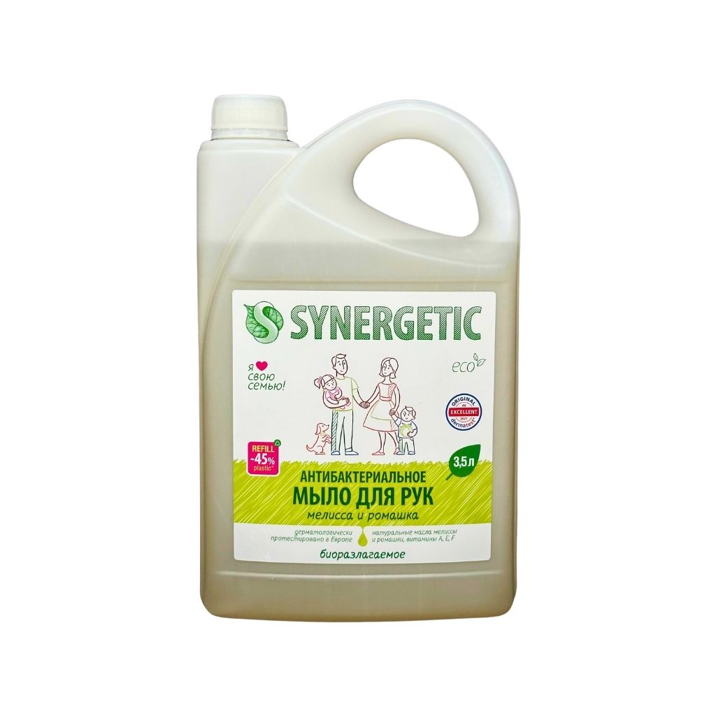 Антибактериальное увлажняющее мыло SYNERGETIC «Мелисса и ромашка» 3,5 л – биоразлагаемое жидкое мыло для бережной очистки рук и тела от любых загрязнений.