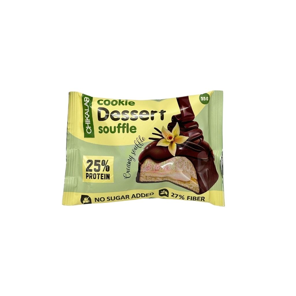 Печенье глазированное с начинкой и суфле Chikalab — это яркий и воздушный десерт без сахара, который придётся по вкусу всем любителям сладкого. В одной порции содержится 14 г белка, клетчатка и начинку: сливочная ваниль.