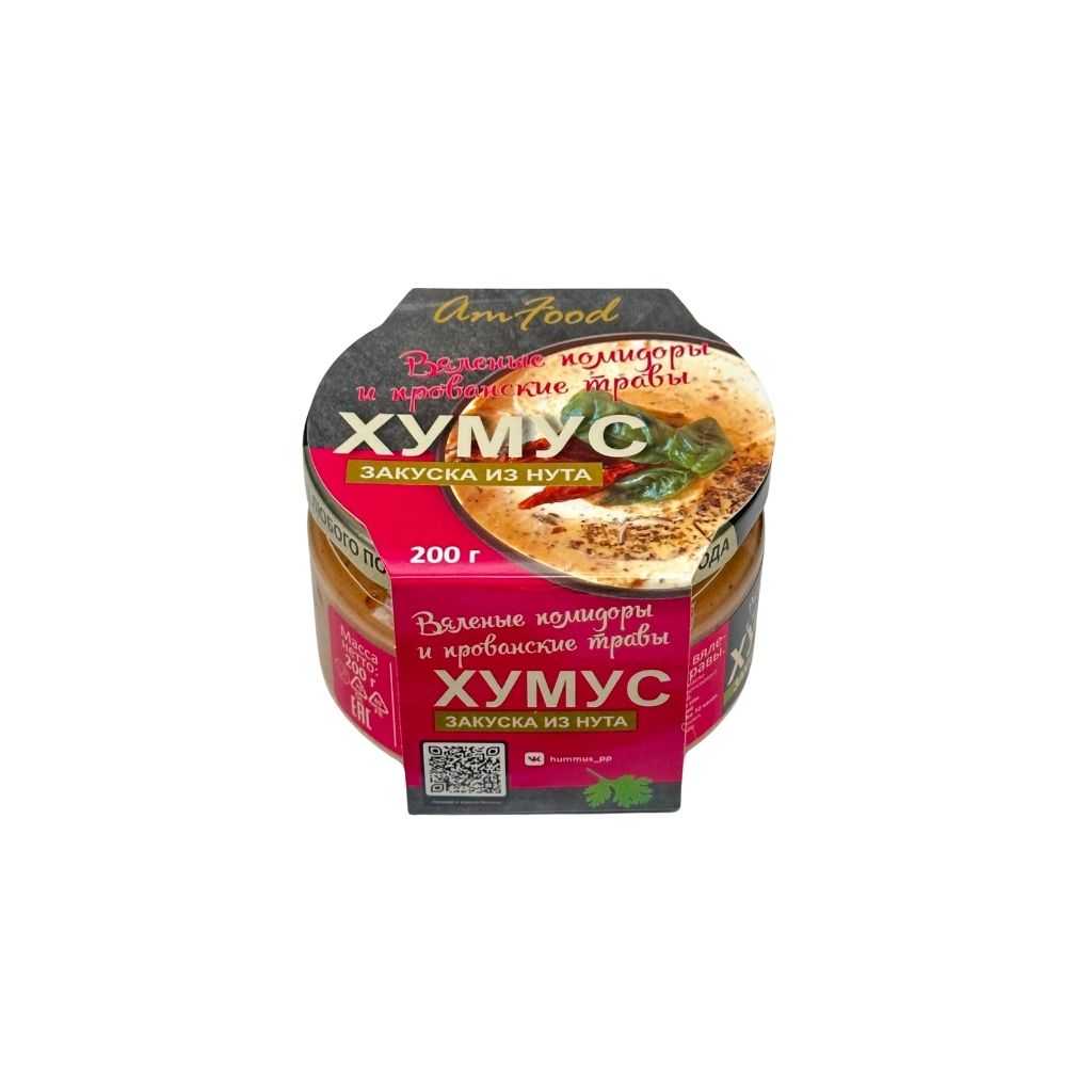 Состав: нут, вода питьевая, кунжутная паста (тахина), масло подсолнечное, масло оливковое, соль, томаты, чеснок, регулятор кислотности лимонная кислота, сорбат калия, бензоат натрия, базилик, петрушка, прованские травы, перец красный молотый.