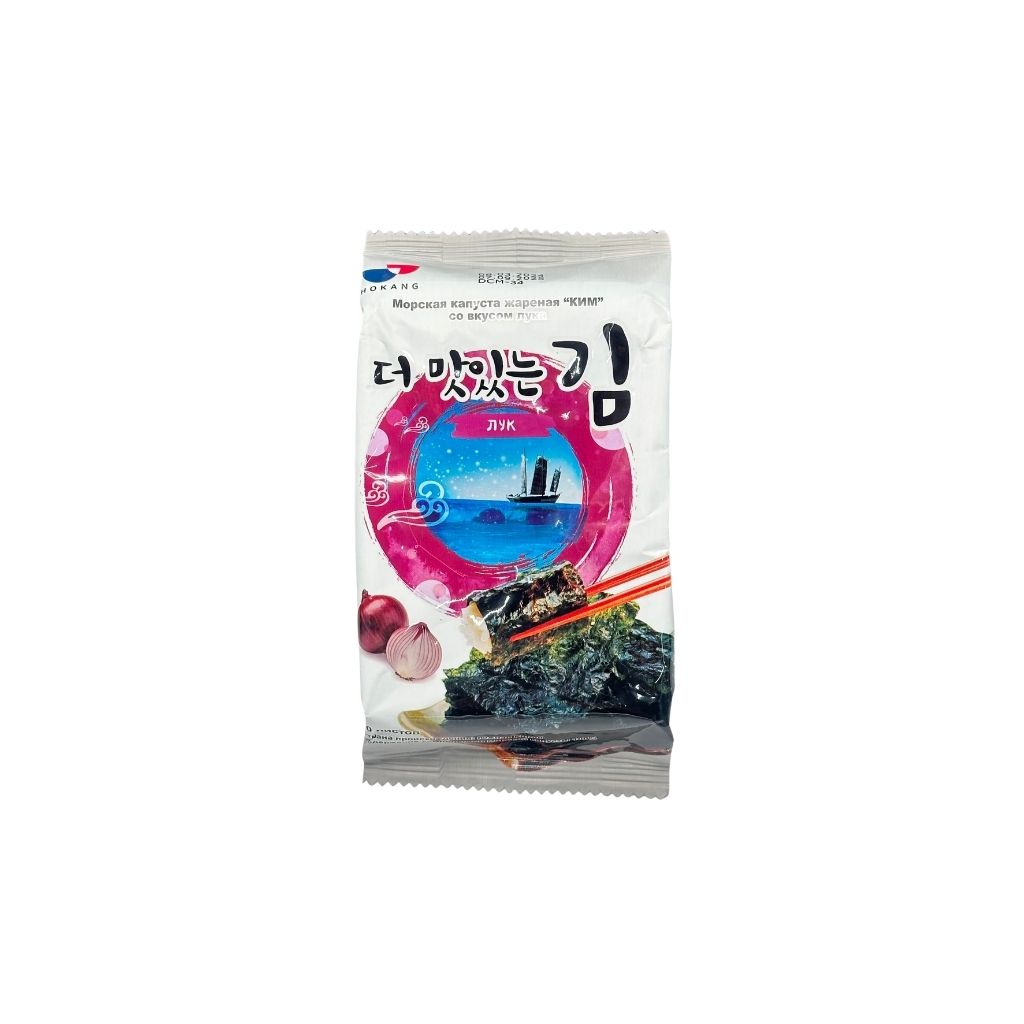 Жареная морская капуста «КИМ» со вкусом лука Hokang – это вкусный и полезный снек из высушенных и обжаренных в ароматном кунжутном масле водорослей нори. Тонкие пластинки нори аппетитно хрустят. Снеки сдобрены луковой приправой, обогащающей их вкусовую гамму. Пластинками жареной морской капусты можно лакомиться просто так, или запивать их пивом и холодными напитками, или добавлять их в мисо-супы, салаты, закуски, а нарезав соломкой - к вареному рису и лапше. Пикантное сочетание вкуса лука и морской капусты обогатит любое блюдо, а хрустящая текстура нори сделает угощения с ними более пикантными. Морская капуста – отличное подспорье для иммунитета благодаря высокому содержанию йода, кальция, железа, магния и витаминов. Употребление продуктов из водорослей нори положительно влияет на работу щитовидной железы, сердечно-сосудистой системы и мозга. Снеки из морской капусты – одни из самых полезных закусок.