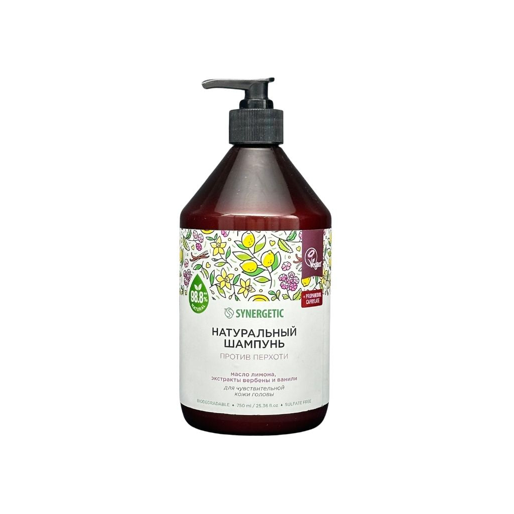 Бессульфатный шампунь SYNERGETIC «Против перхоти для чувствительной кожи головы» — эффективное средство для очищения кожи головы и всех типов волос — более чем на 98% состоит из натуральных компонентов.