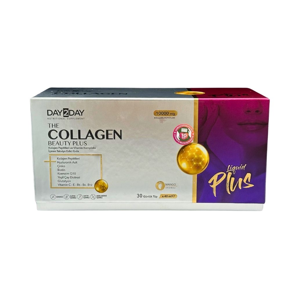 Day2Day The Collagen Beauty Plus — это жидкая питьевая пищевая добавка, содержащая 10 000 мг пептида коллагена, гиалуроновую кислоту, глутатион, кофермент Q10, зеленый чай и витаминный комплекс.