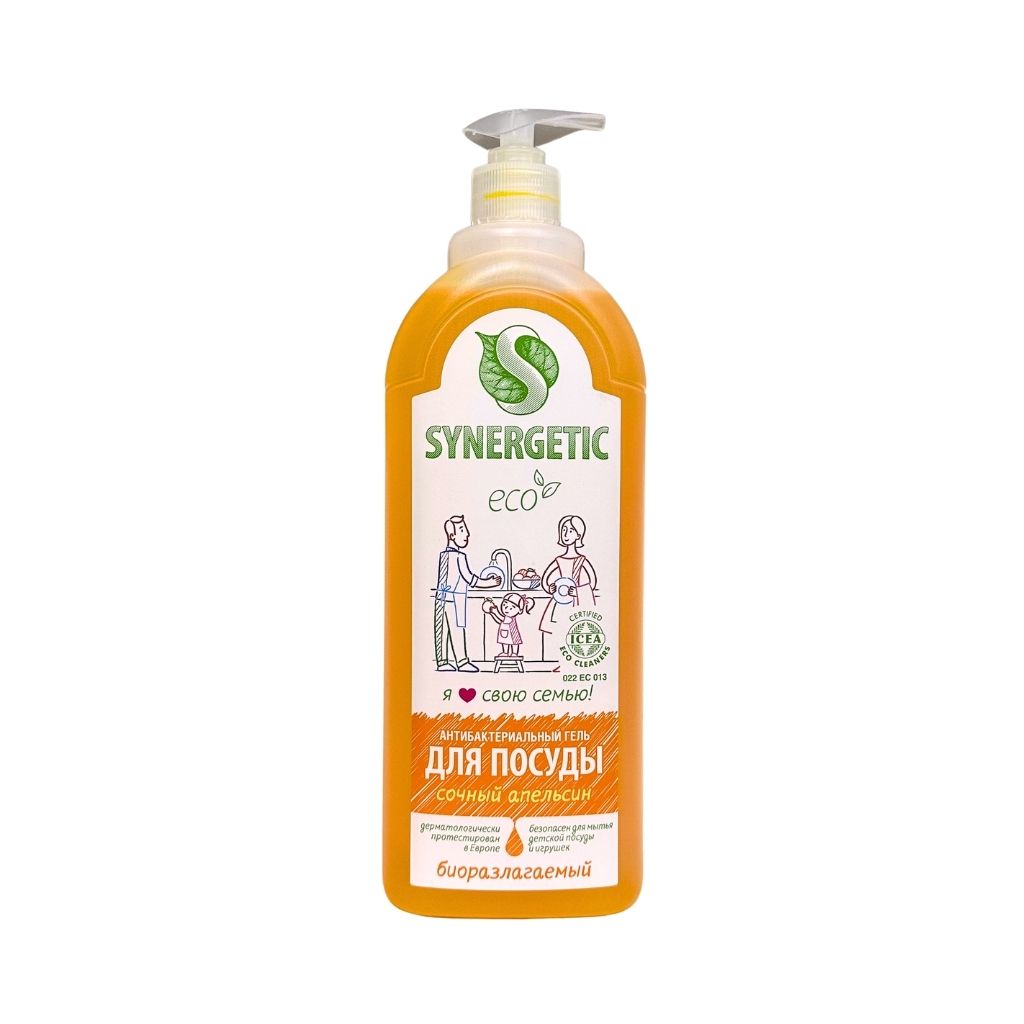 Биоразлагаемый концентрированный гель для посуды с антибактериальным эффектом SYNERGETIC - это экологичное, безопасное и эффективное средство для мытья всех видов посуды, в том числе детской, кухонного инвентаря и детских игрушек от любых видов загрязнений. Он полностью смывается водой и не оставляет следов на посуде. Мягкие биоразлагаемые тензиды из растительного масла обеспечивают хорошее пенообразование и эффективно удаляют жир и запахи даже в холодной воде. Растительный глицерин в составе средства защищает кожу рук от сухости и раздражения. Гипоаллергенная парфюмерная композиция с эфирными маслами апельсина, померанца, петитгрейна, мандарина и бергамота придает средству свежий и приятный аромат. Гипоаллергенный гель дерматологически протестирован в Европе. Международный экологический сертификат ICEA подтверждает биоразлагаемость, безопасность и эффективность средства. Биоразлагаемые компоненты не вредят микрофлоре септических установок. Попадая в среду септика, средство «понятно» для микроорганизмов и без труда распадается на простые соединения.