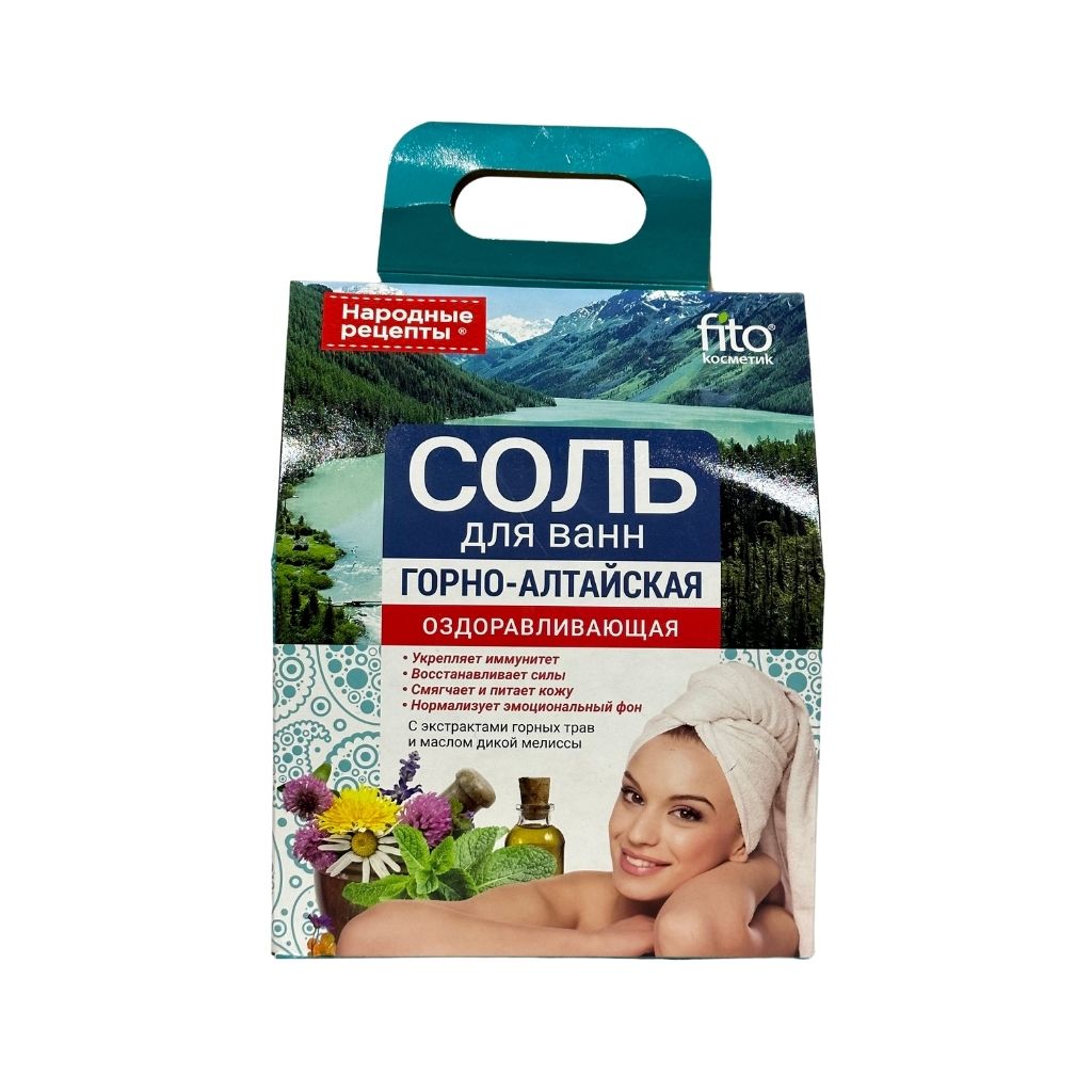 Укрепляет иммунитет, восстанавливает силы, смягчает и питает кожу, нормализует эмоциональный фон В самом сердце Алтая расположились озера с уникальной солью, насыщенной целебной рапой и редкими минералами. Ванны с горно-алтайской солью обладают выраженным оздоравливающим эффектом: укрепляют иммунитет, повышают жизненный тонус, снимают мышечную боль, выводят токсины. Входящие в состав целебные экстракты горных трав смягчают, питают и тонизируют кожу. Ароматное масло дикой мелиссы устраняет усталость, дарит умиротворение, глубокий и здоровый сон.